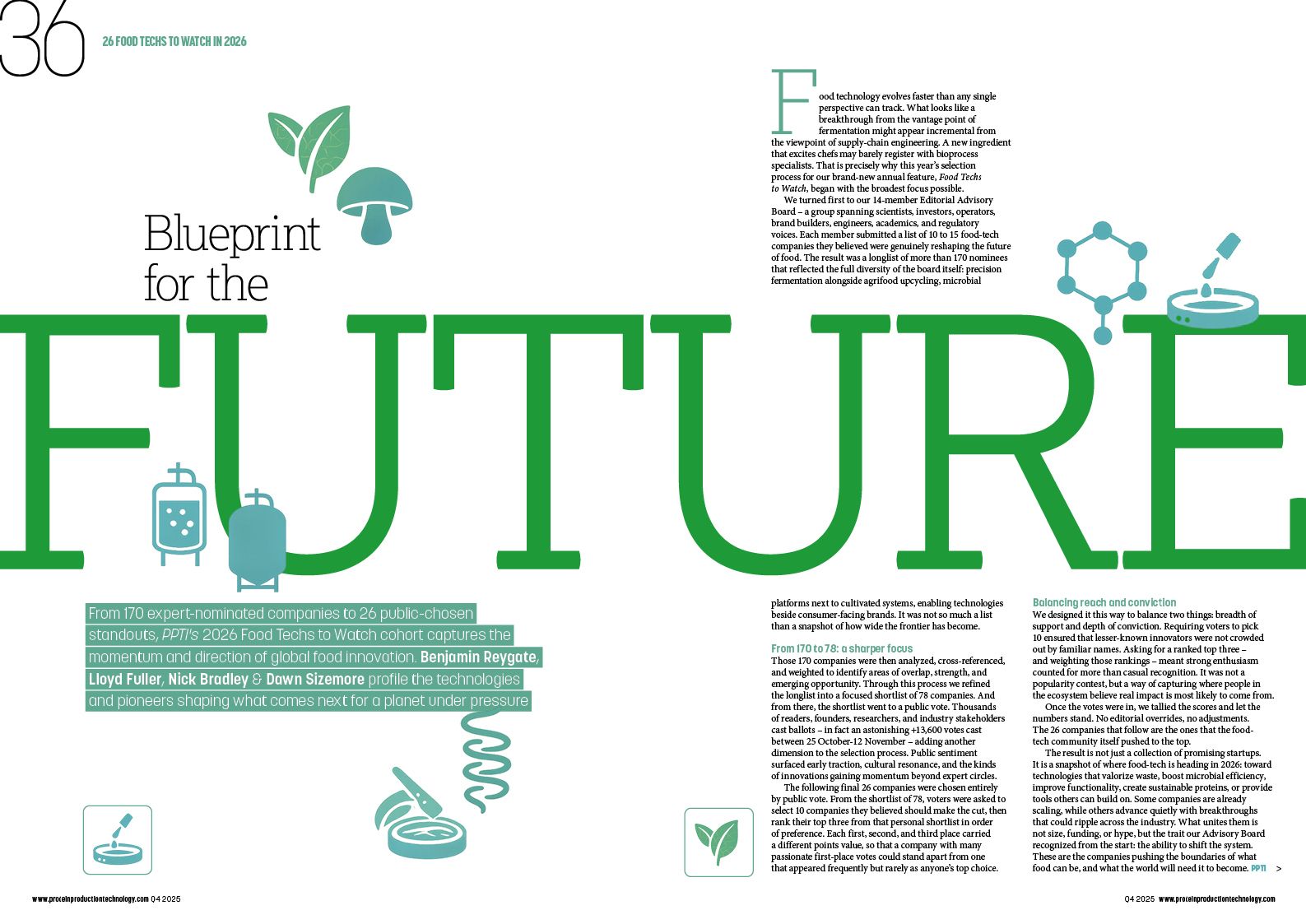 From 170 expert-nominated companies to 26 public-chosen standouts, PPTI's 2026 Food Techs to Watch cohort captures the momentum and direction of global food innovation. Benjamin Reygate, Lloyd Fuller, Nick Bradley & Dawn Sizemore profile the technologies and pioneers shaping what comes next for a planet under pressure