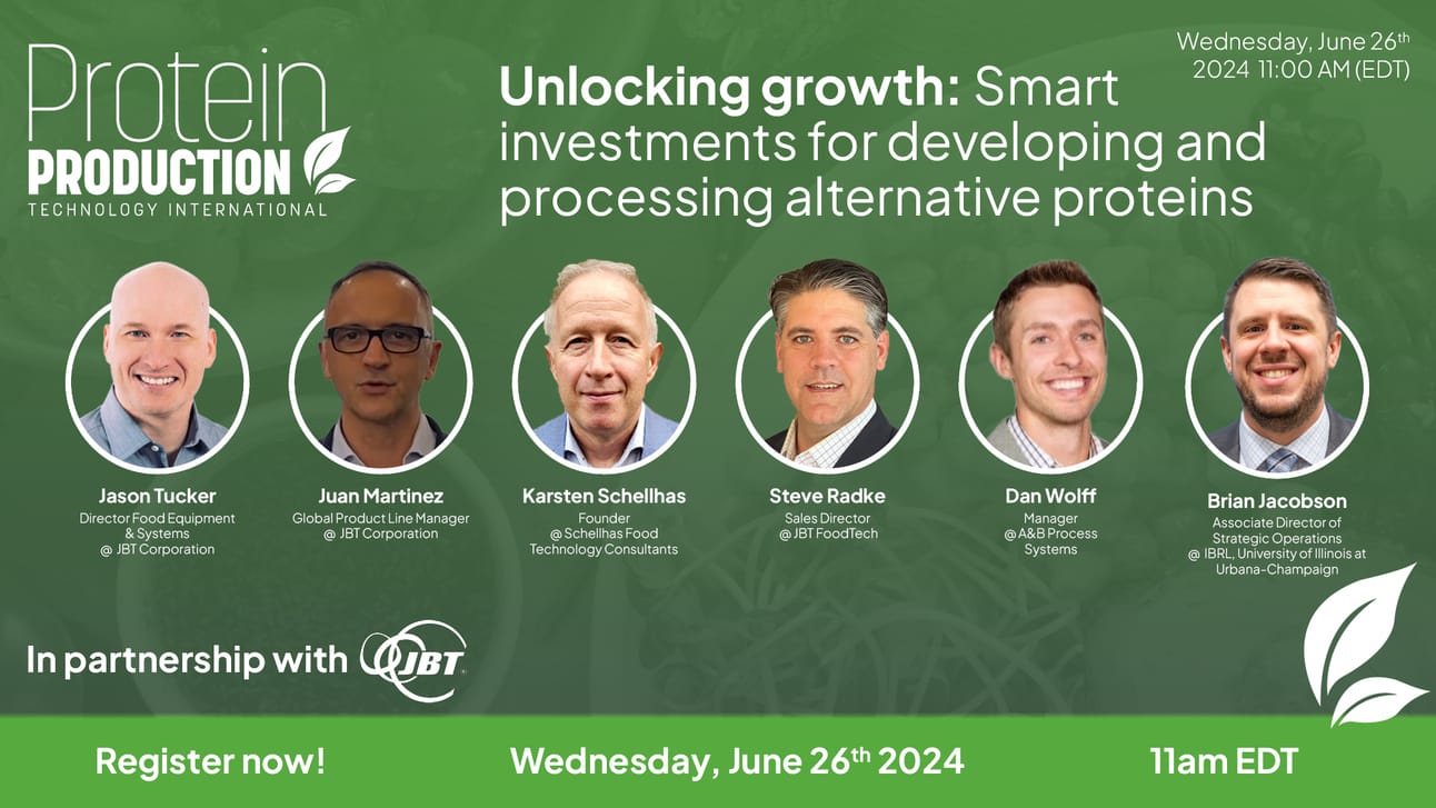 Join this panel of experts for a dynamic webinar titled 'Unlocking Growth: Smart Investments for Developing and Processing Alternative Proteins'. This session is tailored to guide attendees through the strategic partnership opportunities with JBT Corporation, utilizing its Customer Innovation Centers for cutting-edge R&D in alternative proteins. You will learn how collaborating with JBT can empower your venture with the right equipment and expertise to expand production capacities in dairy, plant-based, and cell-cultured proteins. During the webinar, we will discuss how JBT's innovative solutions and state-of-the-art facilities can accelerate your growth and innovation, ensuring sustainable and efficient scaling of operations. We will also explore how its Customer Innovation Centers serve as a hub for pioneering development and processing methods that drive the future of alternative proteins.
