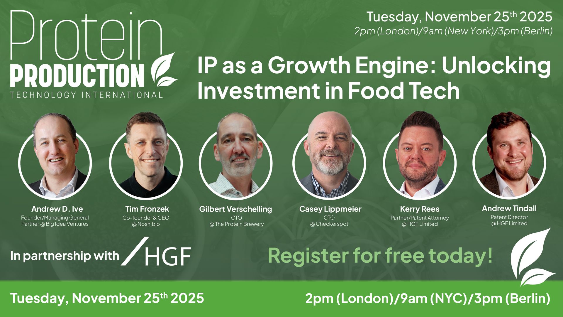 Hear from Kerry Rees and Andrew Tindall, patent attorneys at HGF Limited, Andrew D. Ive from Big Idea Ventures, Tim Fronzek from Nosh.bio, Casey Lippmeier from Checkerspot and Gilbert Verschelling from The Protein Brewery, as they share practical advice and real-world examples of how IP has shaped the success of companies across the alt-protein sector.